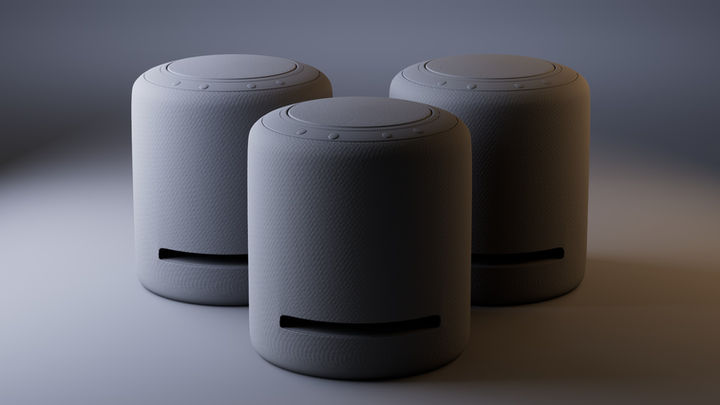 For this render, I used a warm orange key light and a cool blue fill light to create a striking complementary color scheme. This lighting choice enhances the Echo Studio’s fabric texture while giving the scene a sense of depth and mood. The contrast between the dawn-like warmth and the cool, shadowed tones highlights the product’s curves without flattening its form, drawing attention to both design and material quality.